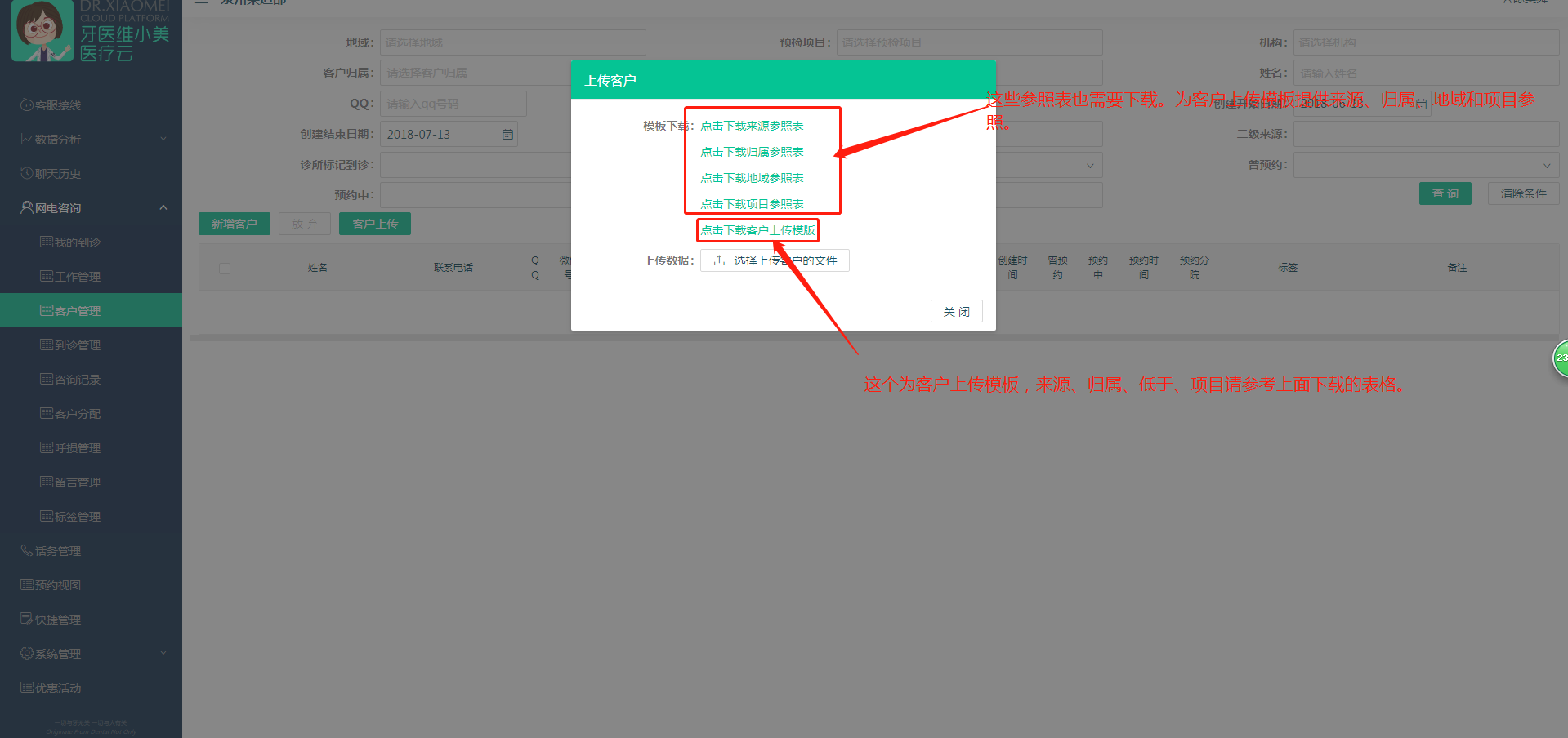 2.找到“客户管理”栏目,点击客户上传,如图: